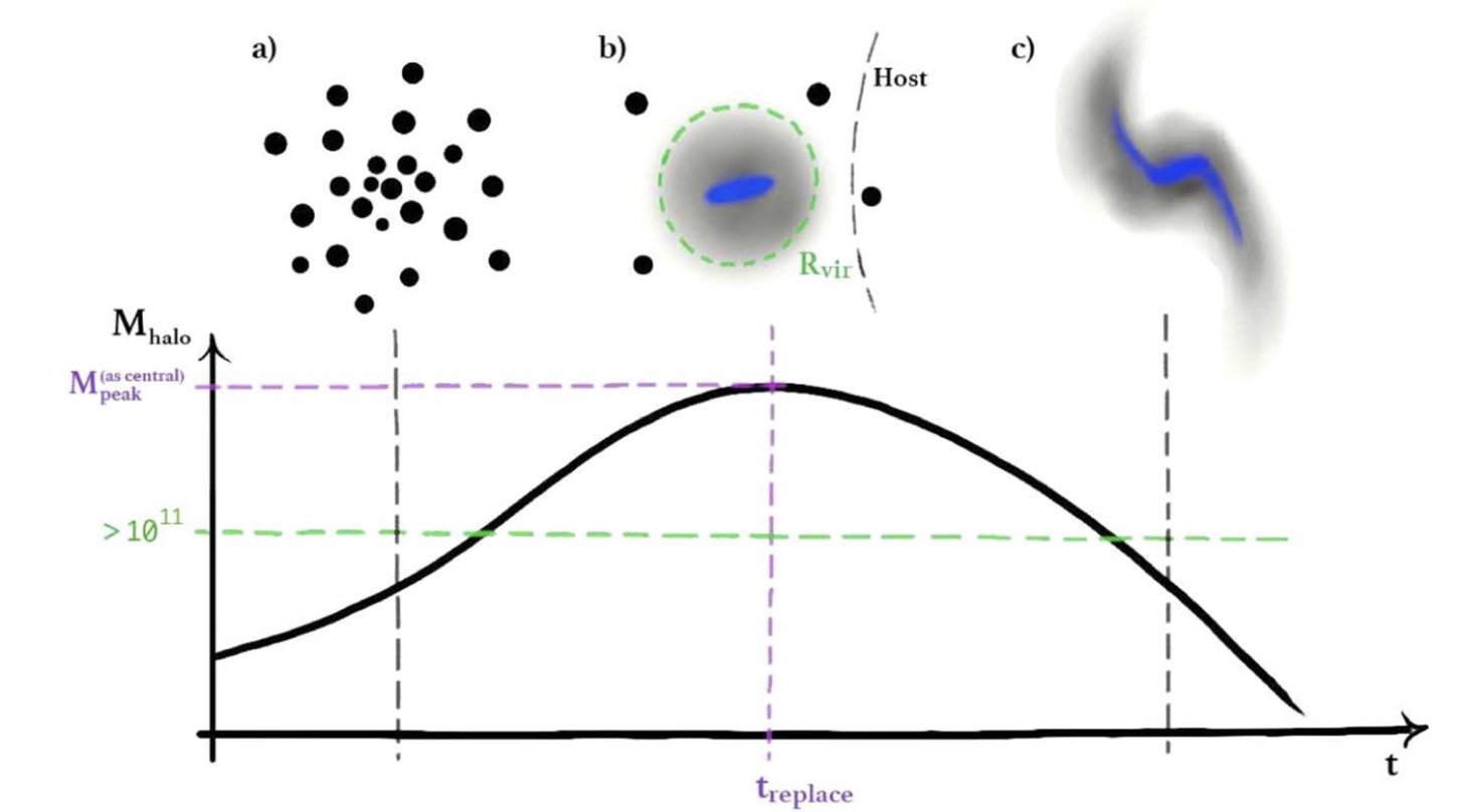 [Cartoon schematic of the time evolution of a halo that reaches Mpeak at treplace. (a) The halo is composed of the low-resolution DM particles (black filled circles) until treplace. (b) The particles in the virial radius of the halo (green dashed circle) are replaced by a high-resolution DM (gray scale) and stellar disk (blue scale) and then (c) fall into the host halo, where they suffer tidal deformation and stripping.]