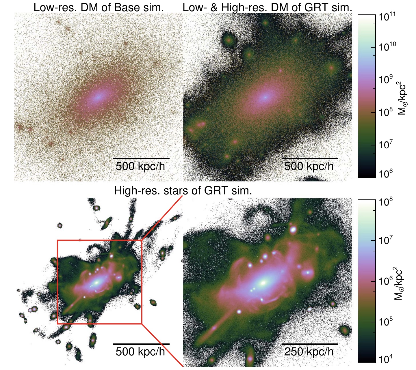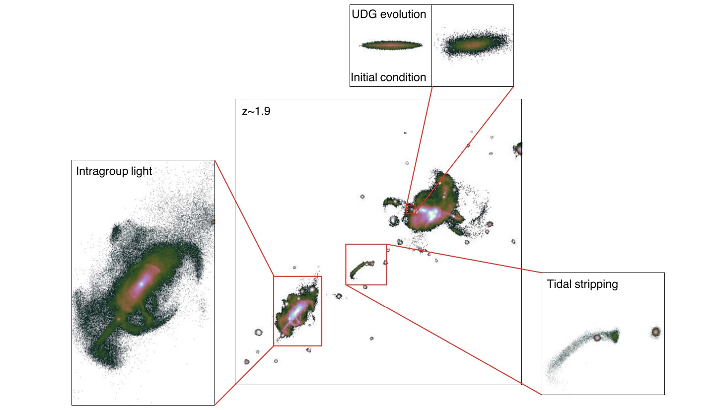[[Structures of the GRT cluster at the epoch of the last major merger. In the central panel, the GRT protocluster is in the upper right and a group-sized halo companion is in the lower left. The left panel indicates the BGG, and the IGL and tidally stripped structure is in the right panel. The top panel indicates a UDG candidate galaxy near the center of the GRT protocluster.]