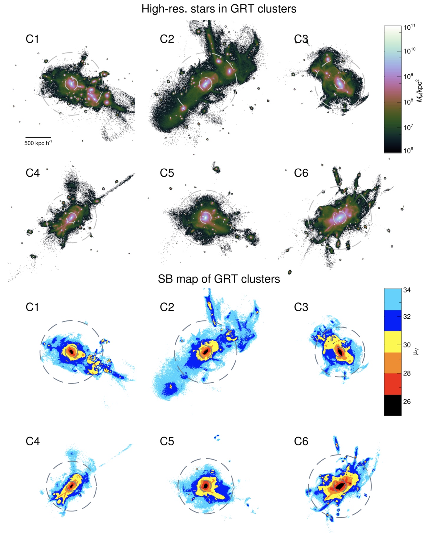[The stellar distribution maps of the six GRT clusters at z = 0. The upper six panels show all the stellar components colored by stellar surface density. The lower six panels show V-band surface brightness (μV) of the ICL and BCG components, except for the satellites. The inner and outer gray dashed circular lines indicate the 0.1 and 0.5 Rvir of each cluster, respectively. Color bars indicate the surface density and V-band surface brightness.]