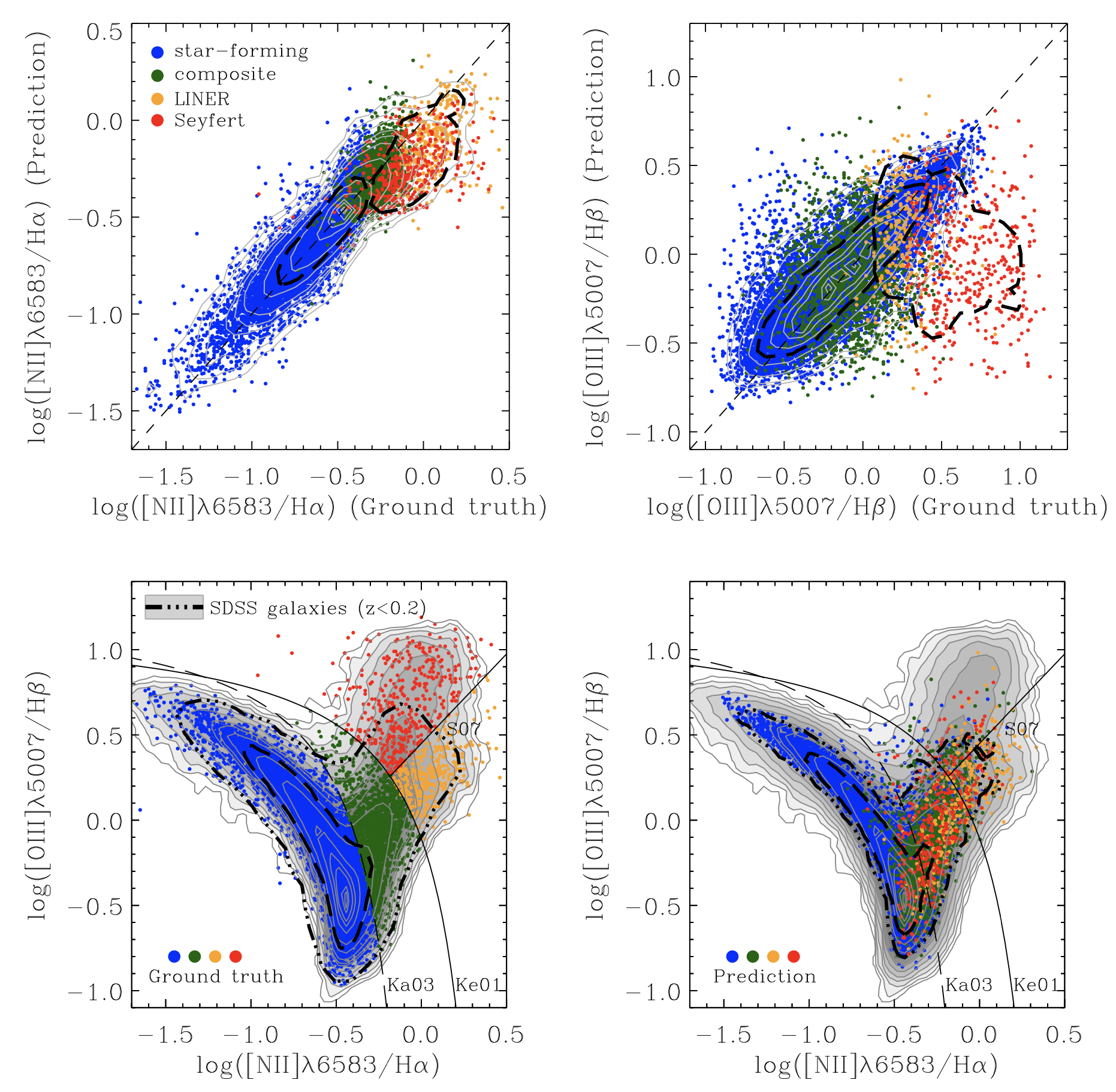 emission-line ratios (upper panels) and their combined results in the BPT diagram